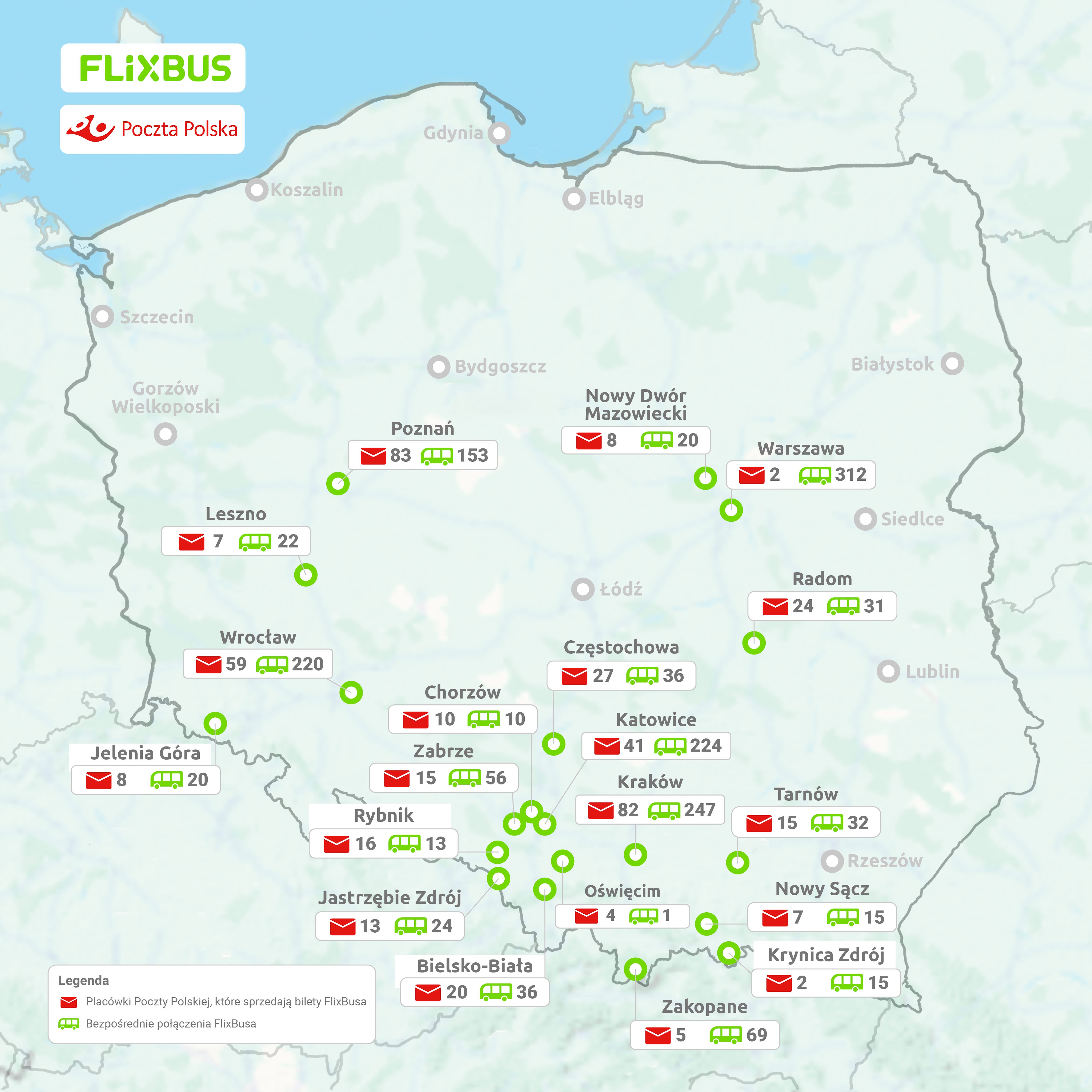 …З 2017 року FlixBus інтенсивно розвиває свою мережу сполучень у Польщі та Європі. Зараз пасажири можуть подорожувати безпосередньо з Польщі до понад 400 пунктів призначення в Польщі та 22 країнах Європи. FlixBus вирізняється своїм сучасним автобусним парком, оснащеним зручними сидіннями, більшим простором для ніг, туалетами, безплатним Wi-Fi та розетками. Додатково, крім ручної поклажі, у вартість квитка входить більший зареєстрований багаж (до 20 кг).