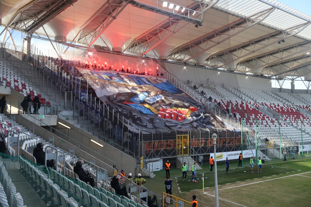 Незважаючи на приїзд з Хожува гранда (в минулому, 14х чемпіон Польщі, 3х володар кубку Польщі, учасник європейських кубків) польскького футболу, вболівалинки не заповнили стадіон на всі 100%. Додатково, за воротамі теж видніли пусті місця, а місцевих суппортерів приїхали підтримати хлопці з Бидгощчи та Білогостоку.